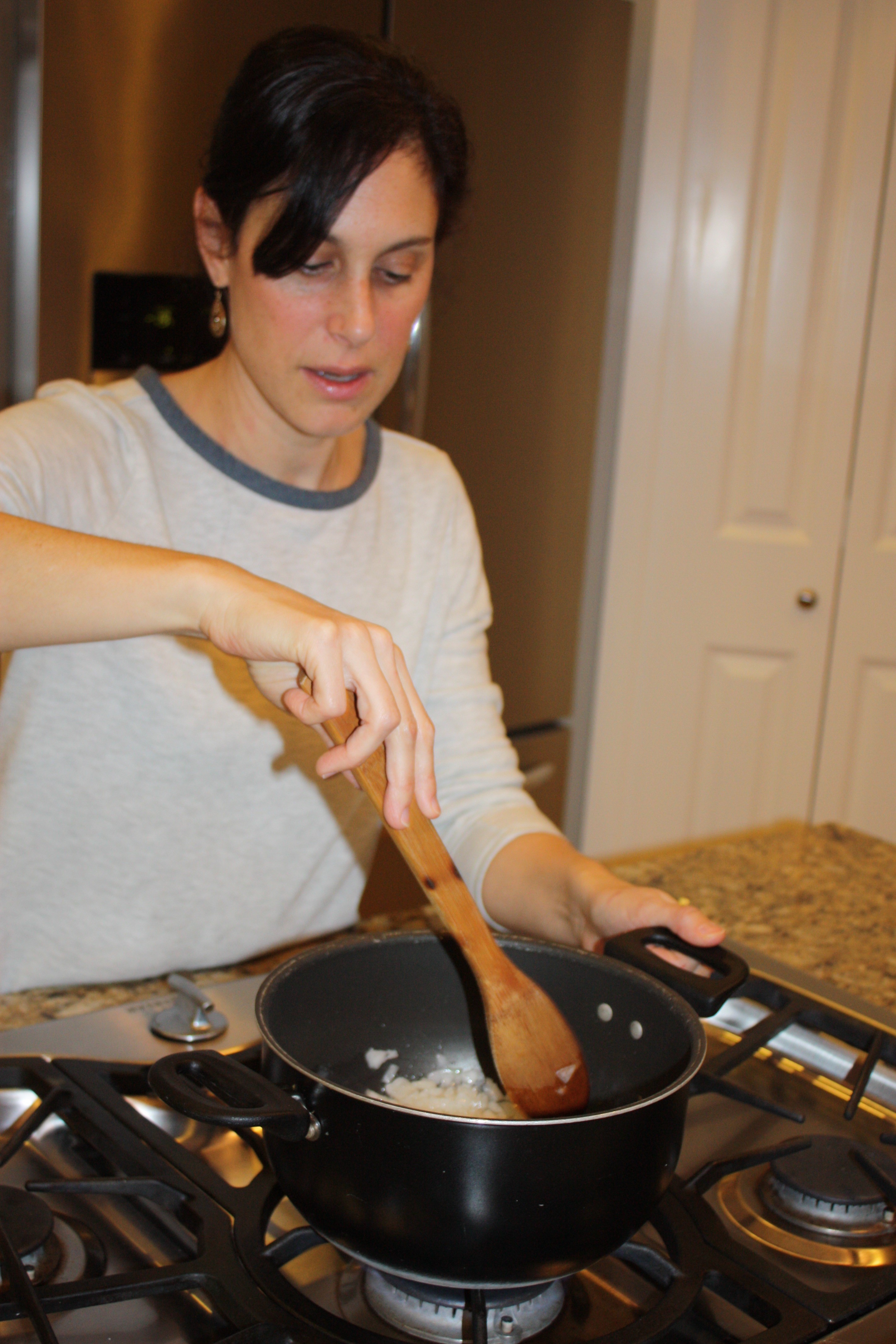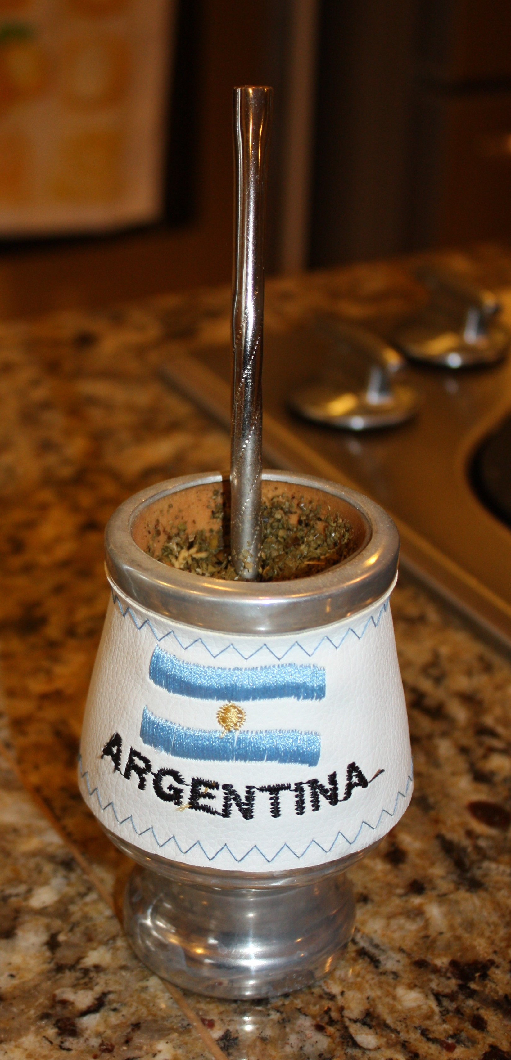 Mate, a savory herbal tea, is always served in the kitchen while a meal is prepared. It is drunk through a filtered straw that keeps the loose leaves in the cup. Mara has a collection of mate mugs and straws in her kitchen.
