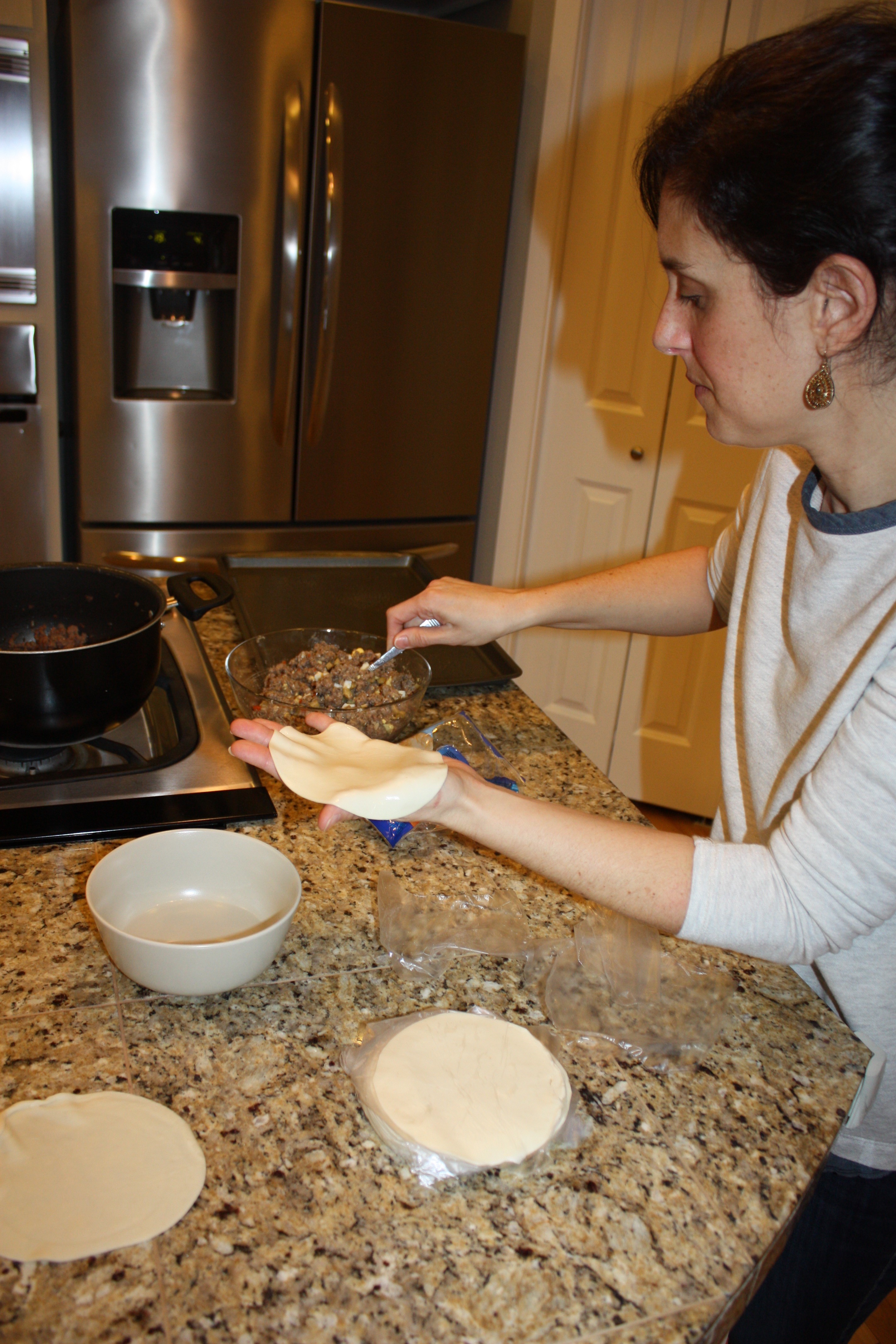 The meat needs to be cooled before you fill the dough. “I always have the meat done by 1 pm, put the meat in the fridge, and then it’s ready to fill for dinner that night.”