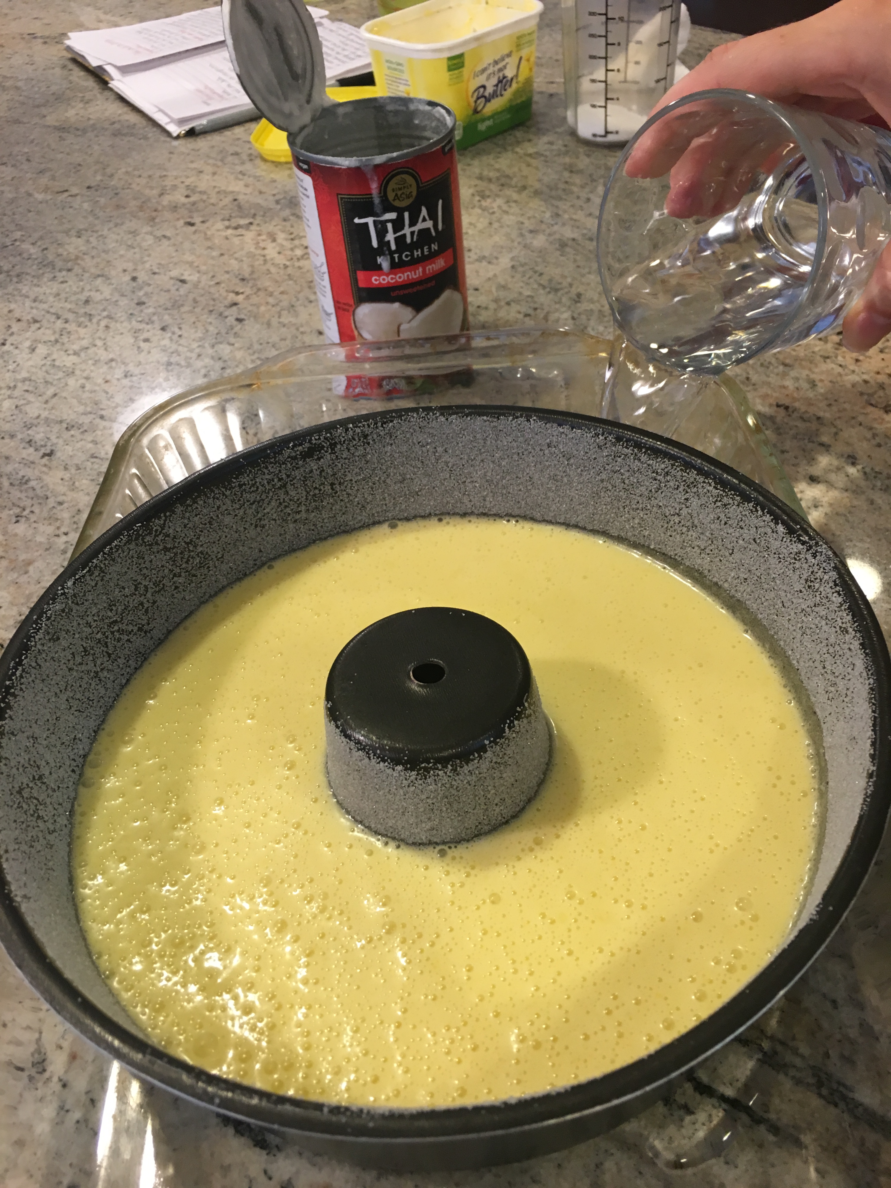 - Pour the mixture into the baking pan. Place the baking dish into a large roasting pan. Pour enough boiling water into the bottom of the roasting pan to reach approximately 1½ inches of water.