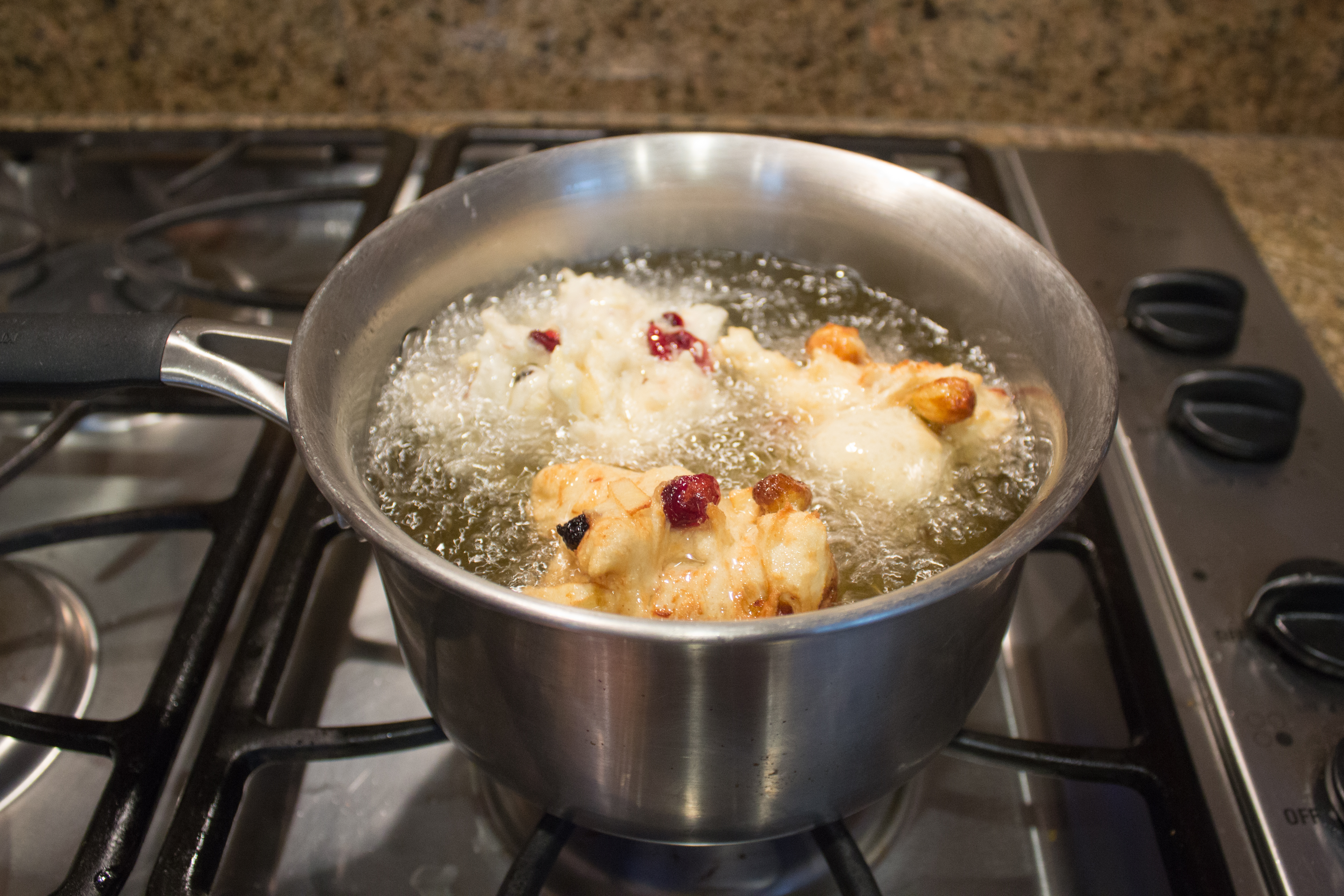 The yeasty dough is filled with raisins and a diced fresh apple. Christina and her dad stand around the boiling pot of oil. Spoons are used to scoop out a large blob of the dough. It is sticky and spotted with the dried and fresh fruits.