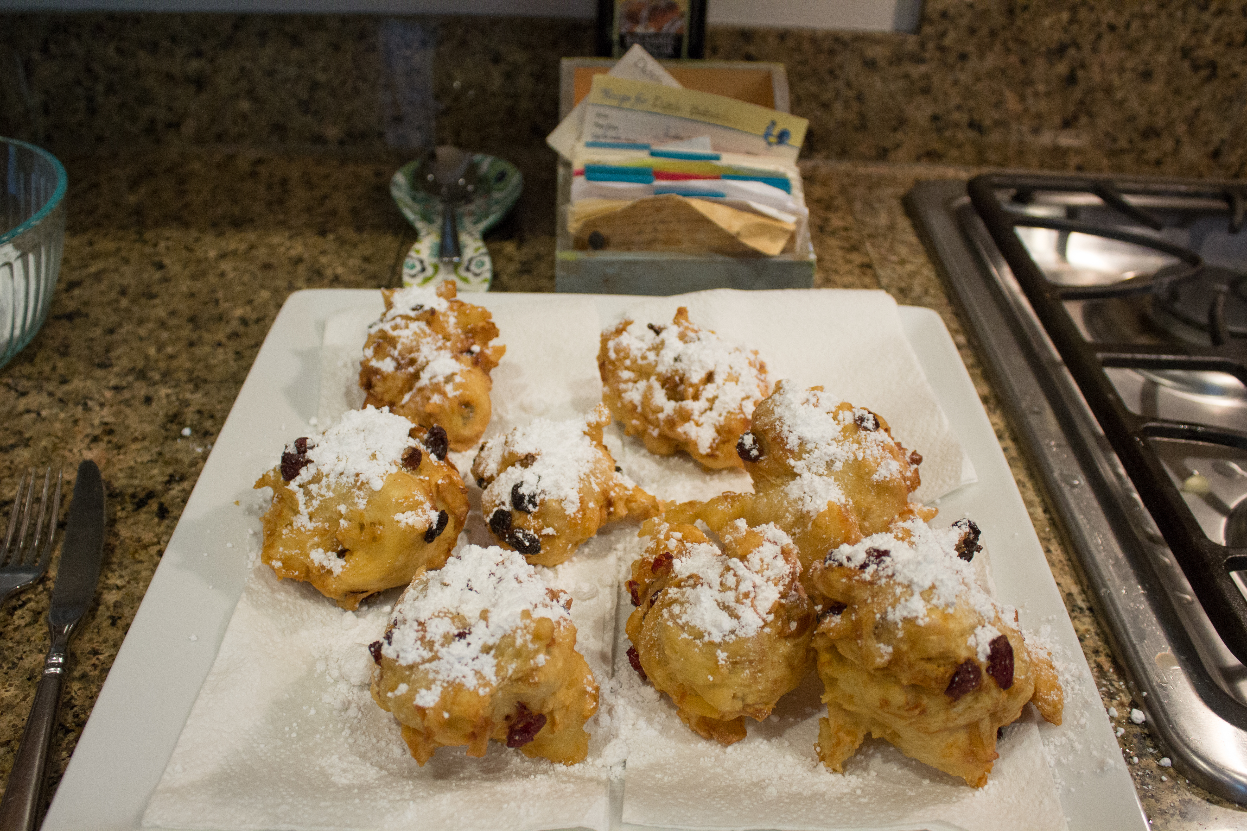 Michael and Christina laugh about memories and traditions. They set an especially crazy shaped Oliebollen aside for Michael’s wife who is out. It’s a tradition that has been carried with the Pronks from the Netherlands, through Ellis Island and now resides safely in the Issaquah Highlands.