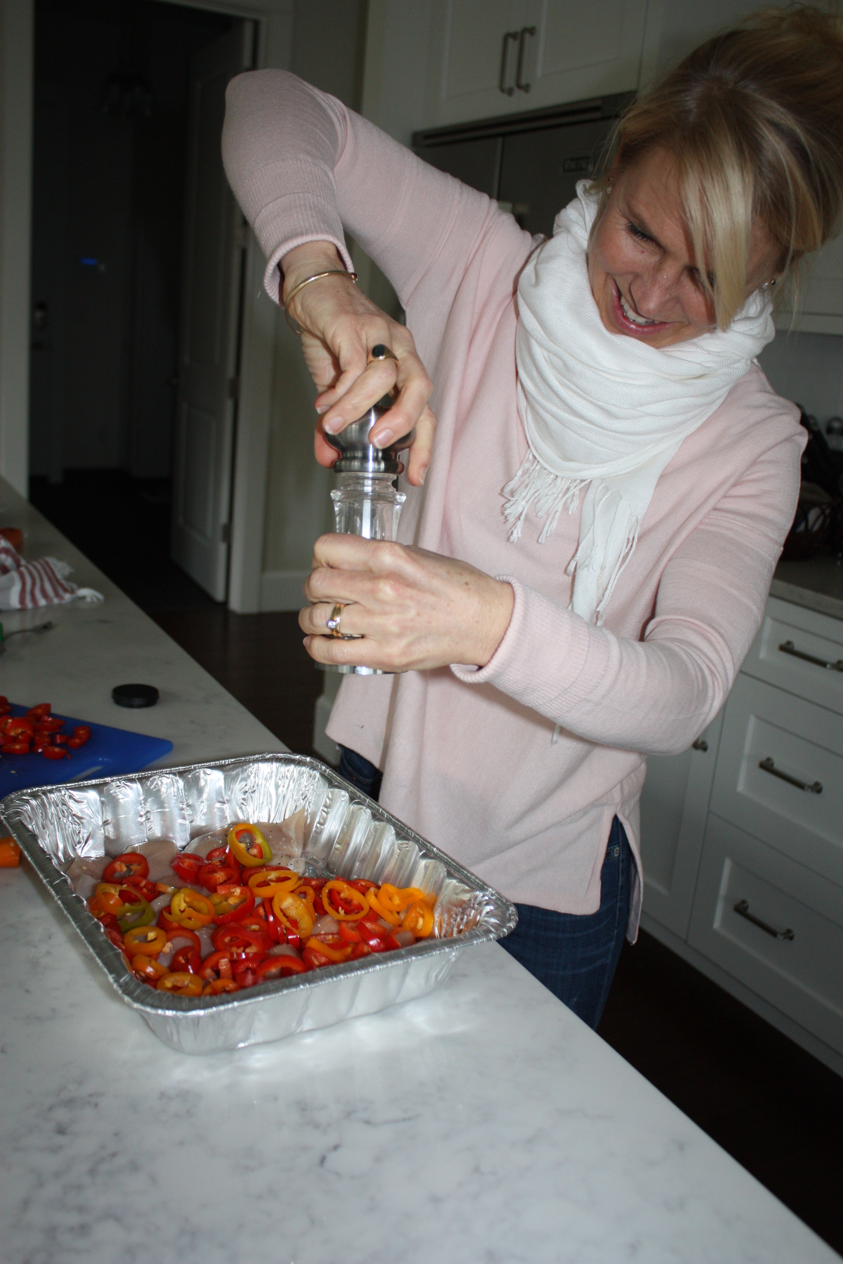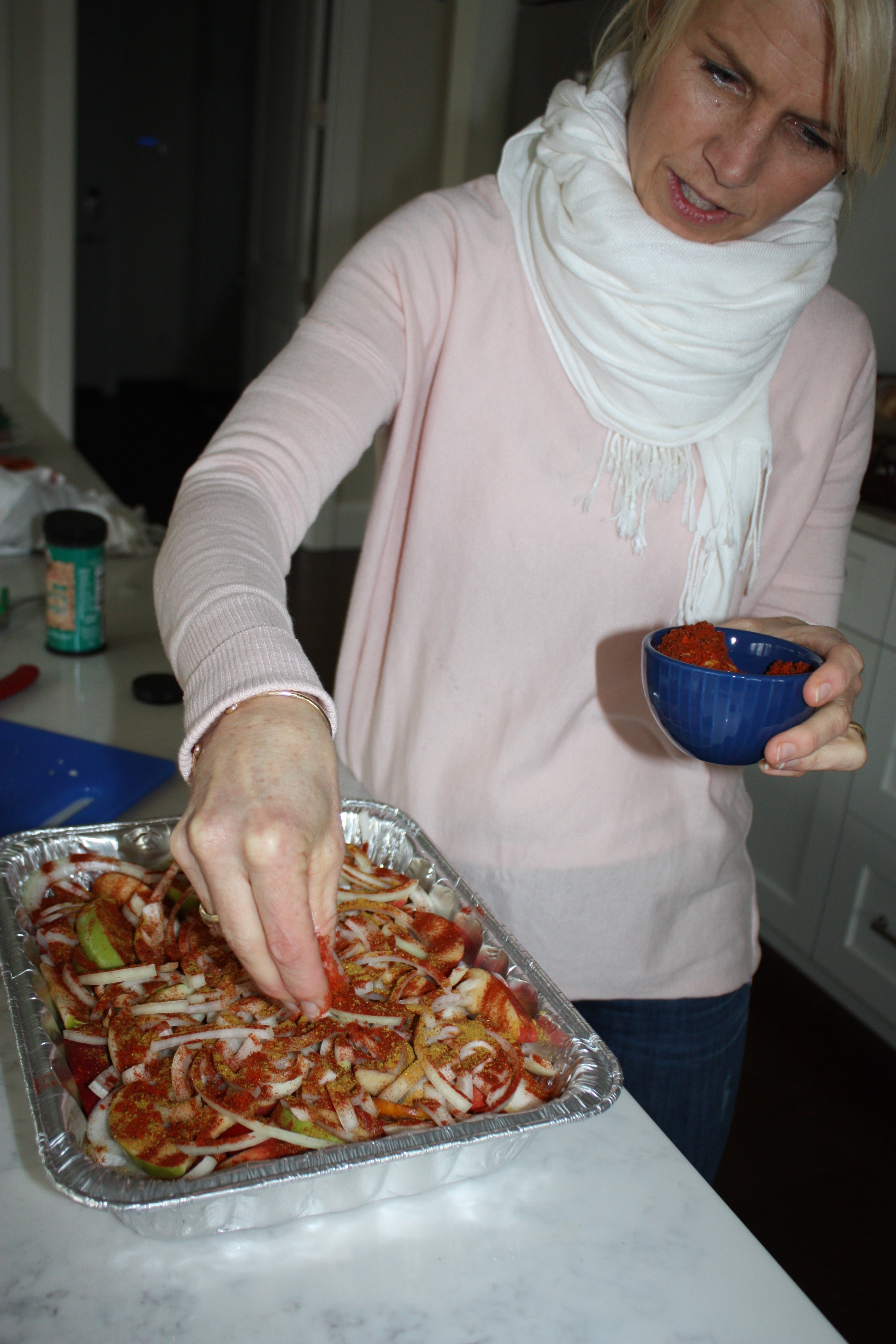 Nathalie layers the chicken, paprika, a special red curry she gets from South Africa, salt and pepper, onions, apples and peppers. She finishes it off with the fruit and pours a bit of the juices from the canned fruit and some chicken broth over the top. The dish goes into the oven covered with aluminum foil.