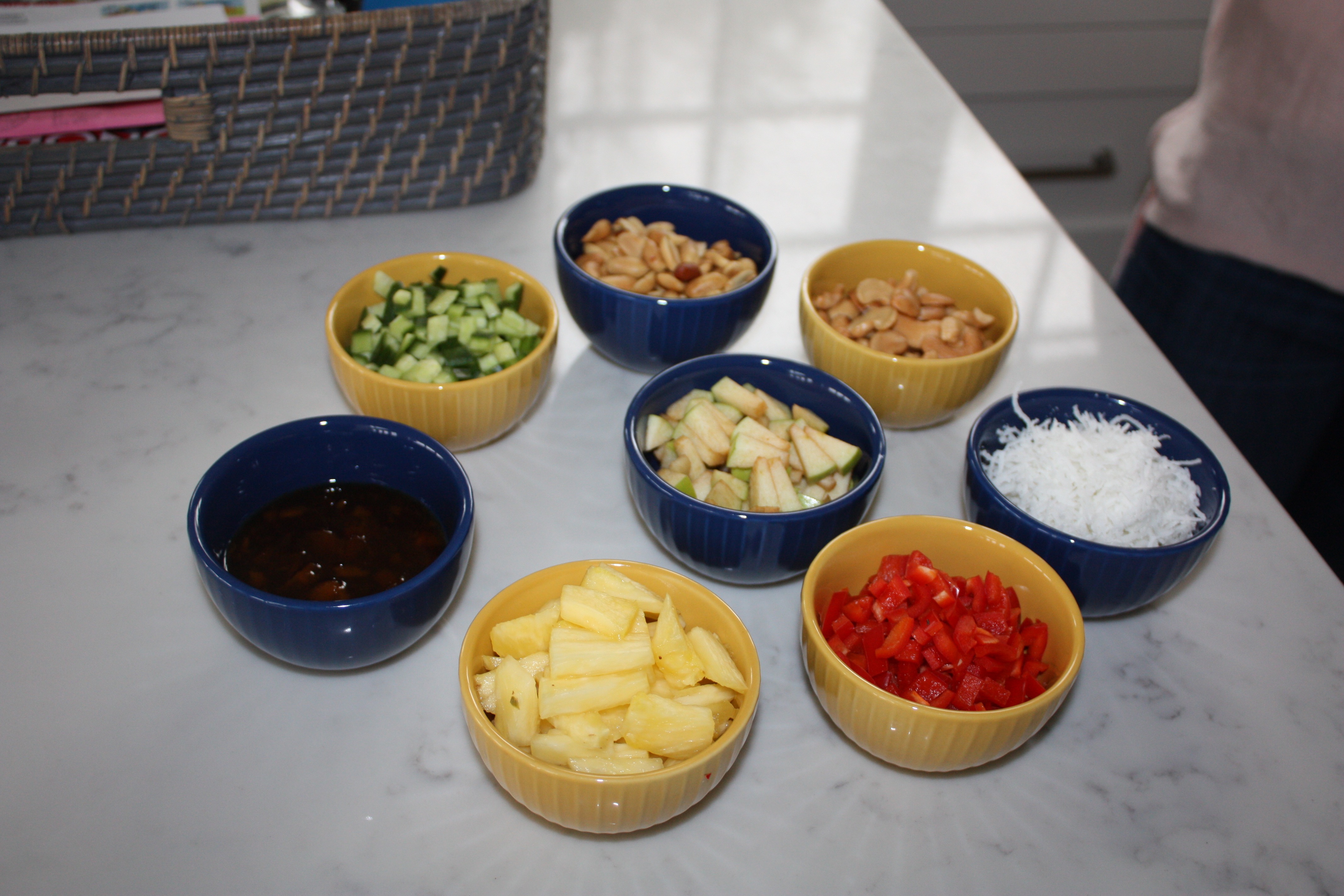 Cubed cucumbers, cubed peppers, cubed pineapple, cubed apples, sliced bananas, chutney, shaved coconut, cashew nuts and peanuts.