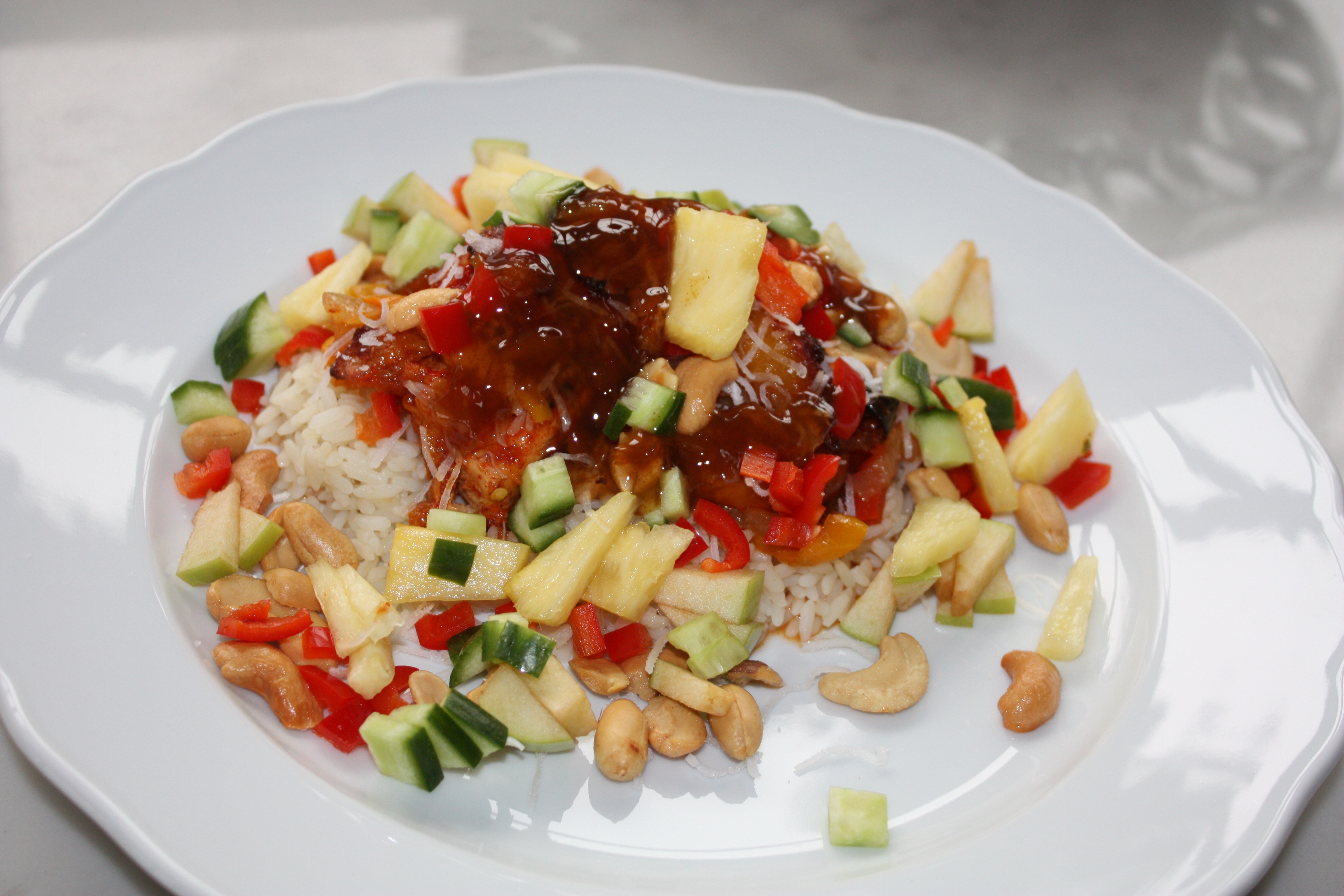 The Ukubaba Inkukhu comes out of the oven hot and bubbly. The layers have melted together and the sugars have browned on top. Nathalie dishes a serving over the hot rice. And then she adds the toppings. Choosing from diced pineapple, cucumber, sweet red peppers, shredded coconut, cashews and peanuts and topped with a South African chutney you can buy at World Market. She adds a little bit of everything.