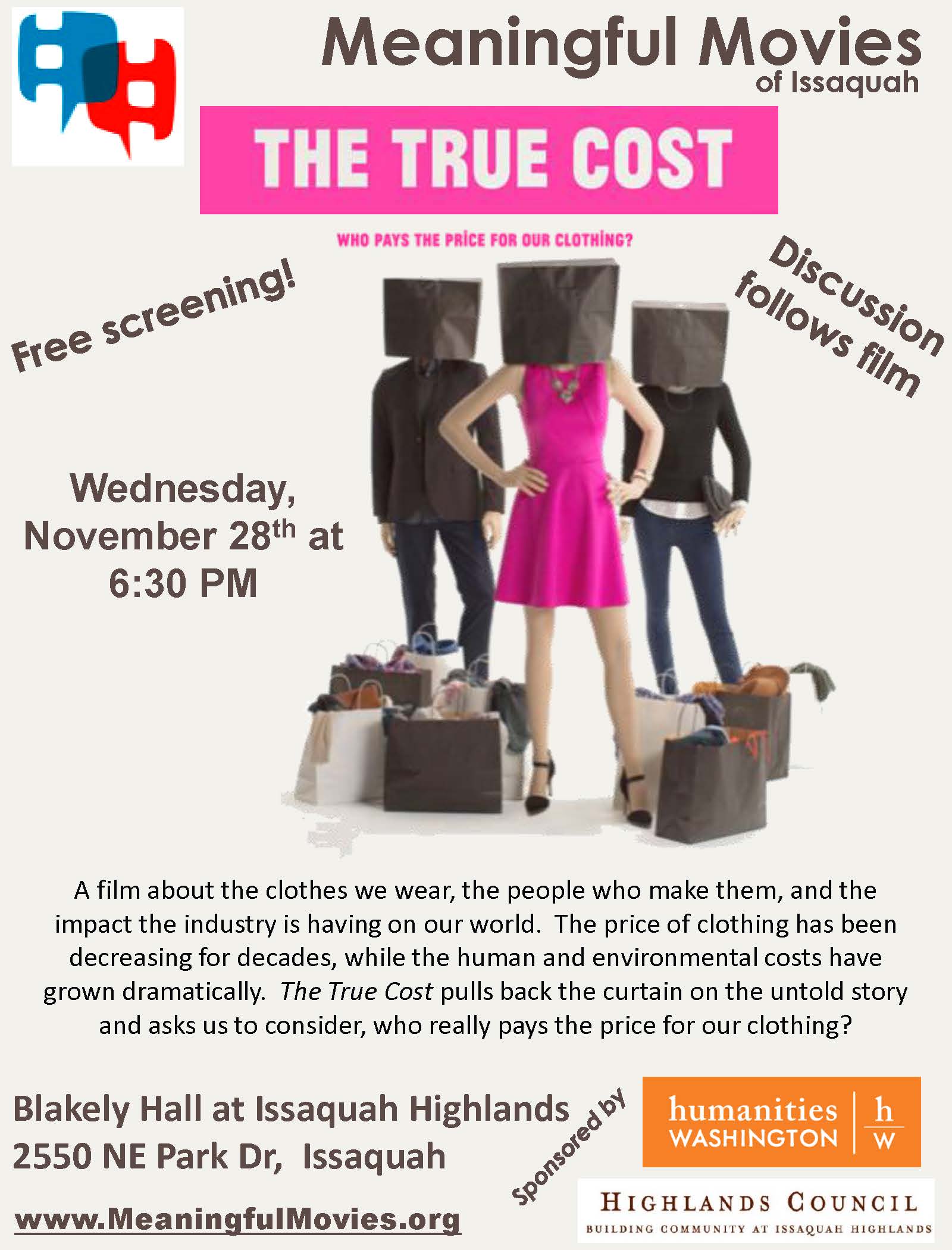 Join us November 28 for The True Cost: A film about the clothes we wear, the people who make them, and the impact the industry is having on our world. The price of clothing has been decreasing for decades, while human and environmental costs have grown dramatically. The True Cost pulls back the curtain on the untold story and asks us to consider, who really pays the price for our clothing?