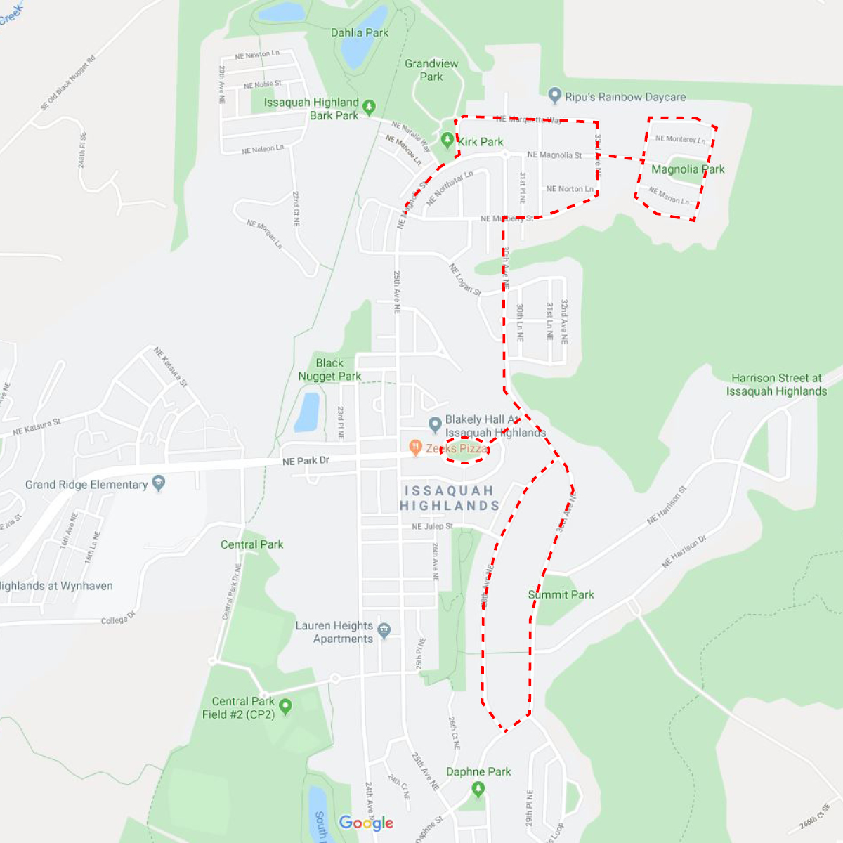 Eastside Fire and Rescue’s Reindeer Engine and Santa will drive around Issaquah Highlands on Sunday, December 15, starting at 5:00 pm. See route map below.