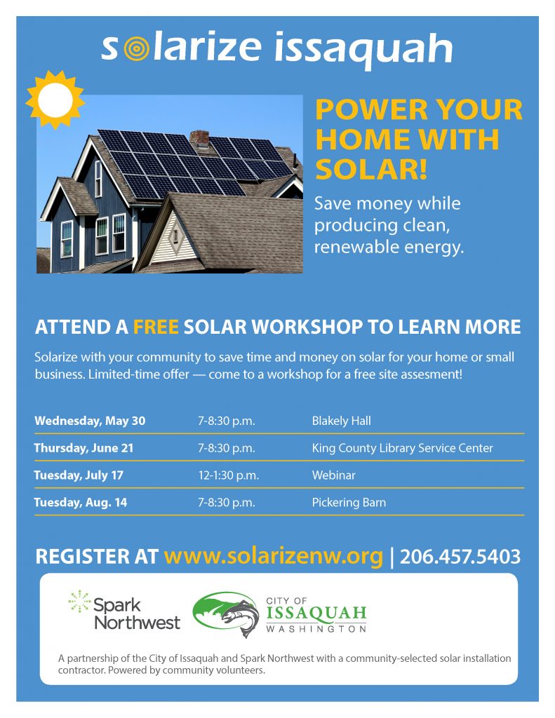 Attend this free solar workshop sponsored by the City of Issaquah and Spark Northwest to learn about powering your home with solar.