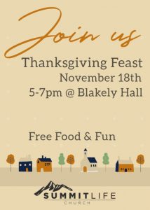 All are invited to join Summit Life Church for free food and fun to celebrate Thanksgiving!