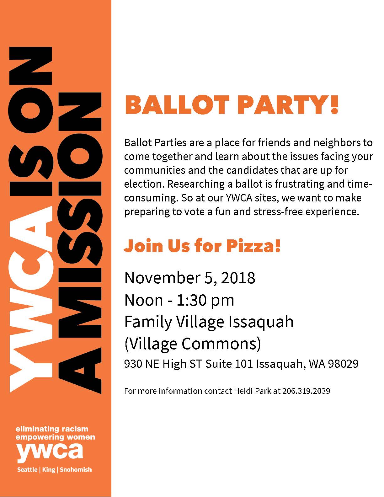 Ballot Parties are a place for friends and neighbors to come together and learn about the issues facing your communities and the candidates that are up for election. Researching a ballot is frustrating and time-consuming. The YWCA wants to make preparing to vote a fun and stress-free experience.