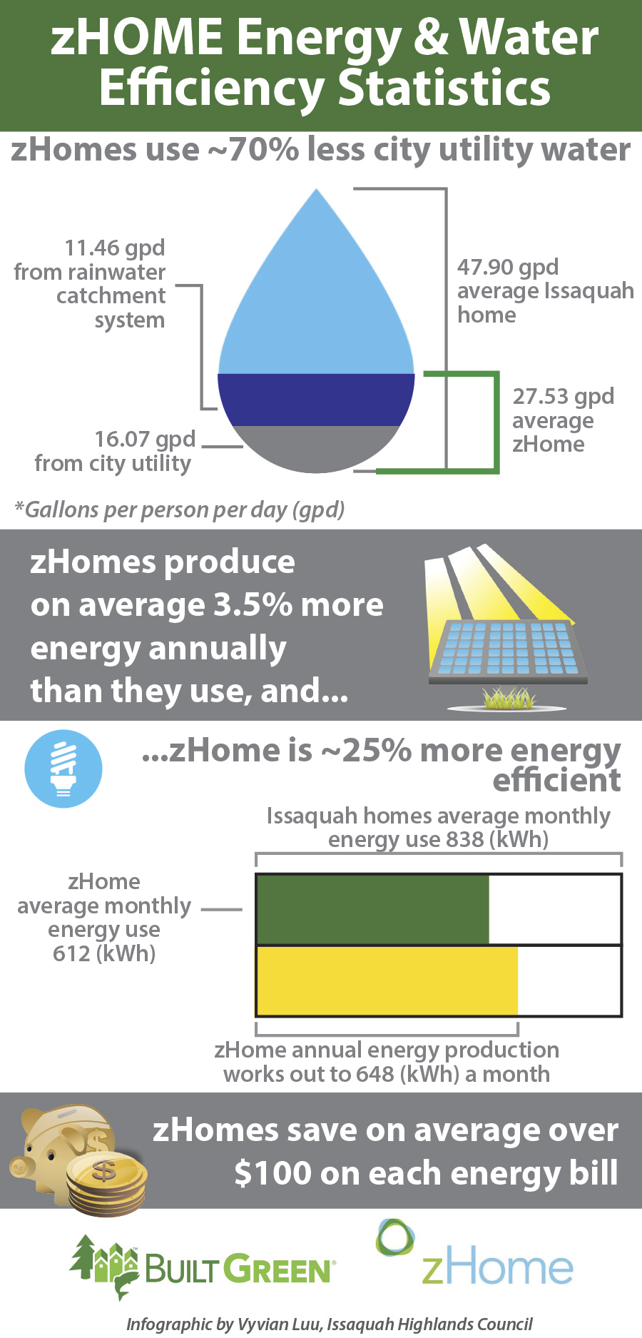 zHome is just one of the many sustainability stars in Issaquah Highlands, a project to be proud of and to learn from. See their informative website at zHome.org. Stop by the neighborhood on your way to the movies or the park and ride. There you will see the features first hand while you can read the many placards on site describing the technology and building designs the neighborhood employs.