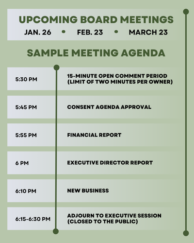 The IHCA Board of Directors meets on the fourth Monday of every month, except for several dates moved forward due to holidays. All meetings start at 5:30 p.m. Check the online calendar for Zoom links, date changes and additional details.