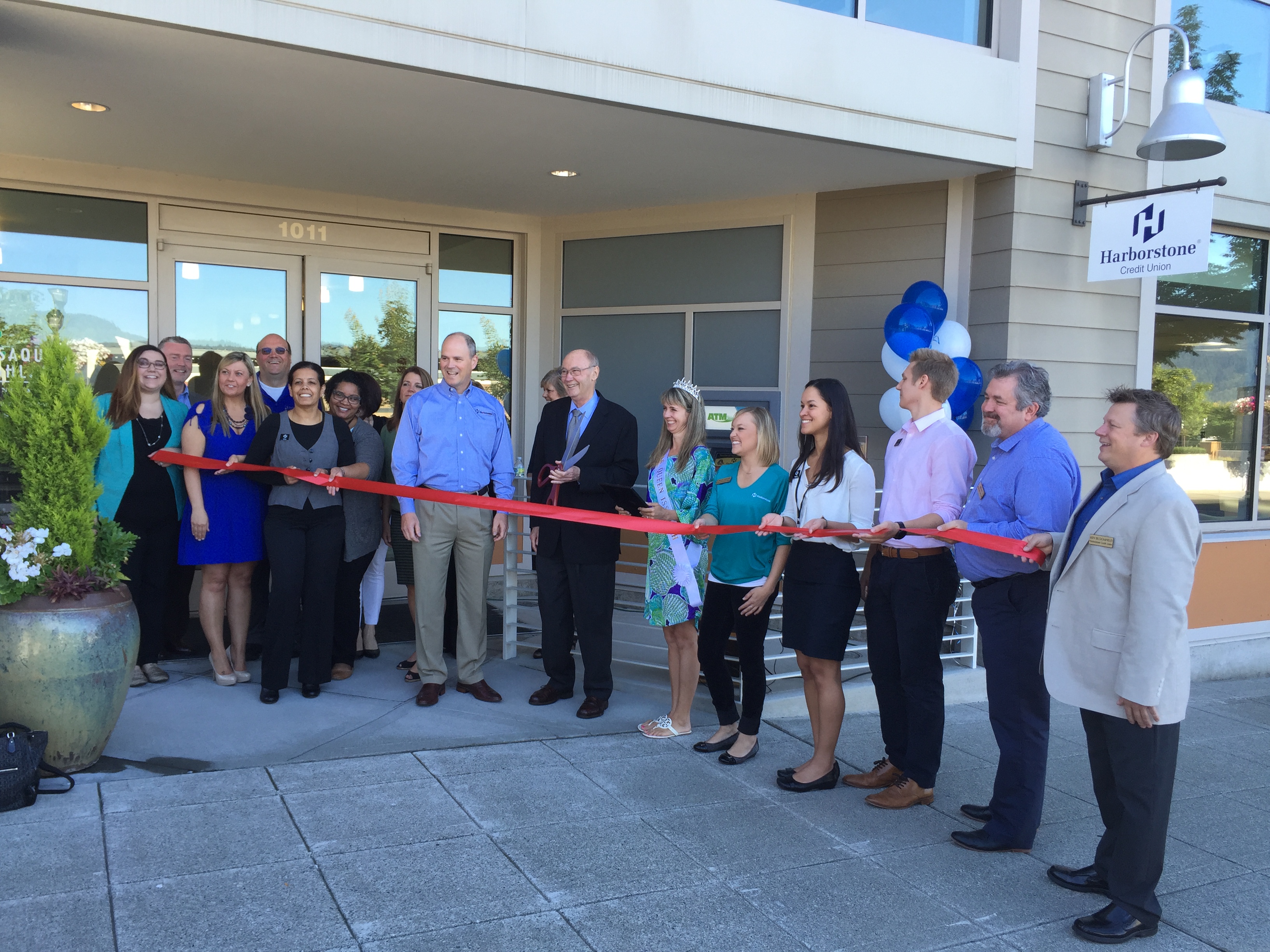 This morning the community gathered at Harborstone CU, our newest business to open in Grand Ridge Plaza, Issaquah Highlands, located at the corner of High Street and 10th, right next to Ben and Jerry’s. Issaquah Mayor Fred Butler and Harborstone CEO Phil Jones did the honors, with the Issaquah Chamber of Commerce Queen of Issaquah, Sandy Marshall, bestowing the O-Fishal proclamation.