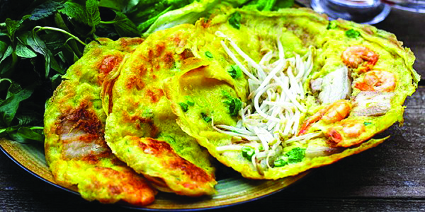 A brief introduction for those who didn’t grow up in sometimes-rainy Da Nang: Banh xeo means “sizzling cake”, for the distinctive sound the batter makes when it hits the hot oil in the pan. While many assume that banh xeo descends from the French crepe, the dish’s origins actually predate the arrival of French colonizers. More similar to an Indian dosa, banh xeo contains mung beans, coconut milk, and turmeric, all evidence of more Indian influence than French.