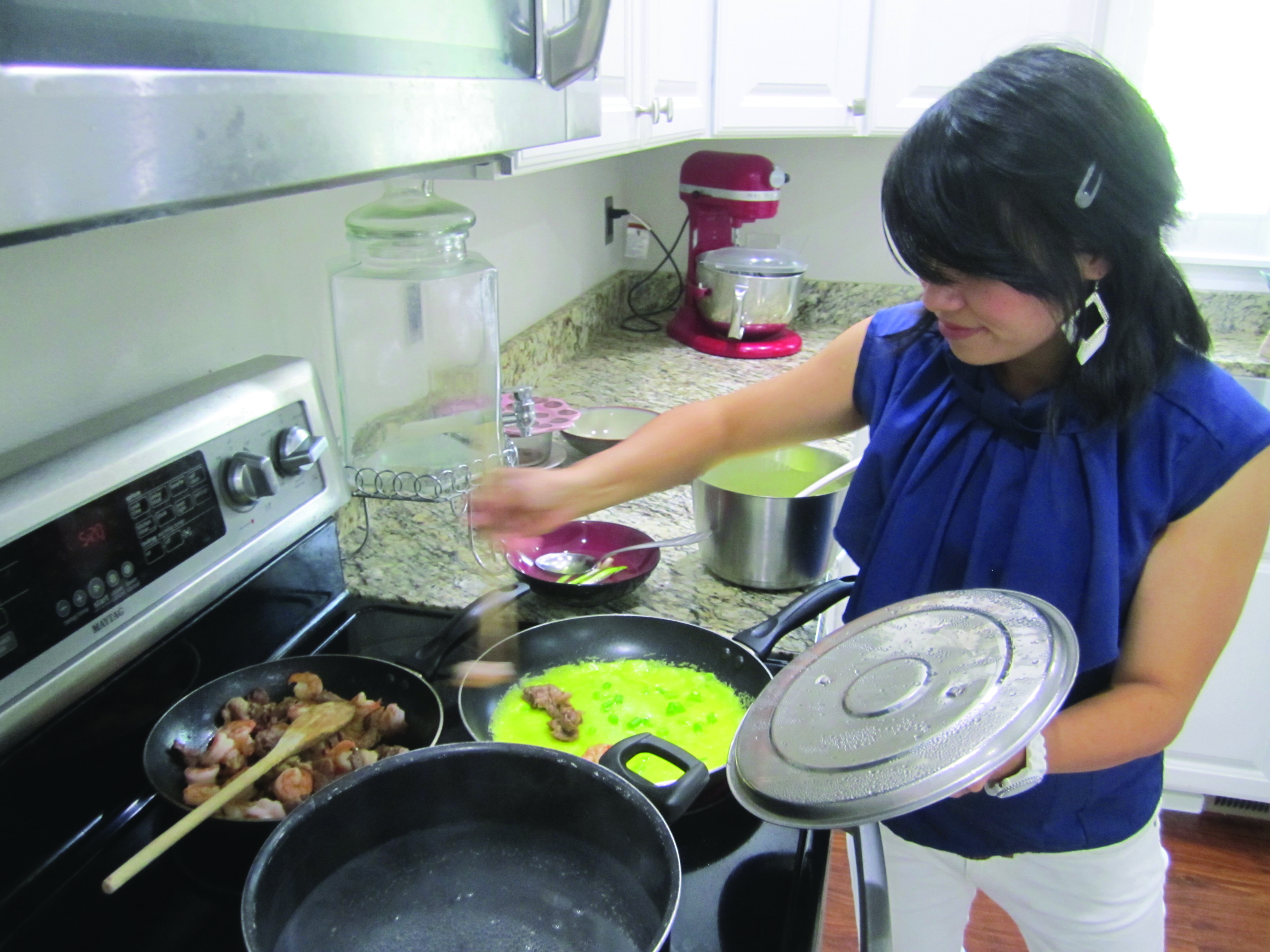 Imagine a little girl standing on her front porch in Da Nang, Vietnam. Her mother is at work, an accomplished tailor by trade. Her father is inside tending the other children. Rain is pouring down, and this thought comes to the little girl’s mind: “Time to crush up some rice and make banh xeo.”