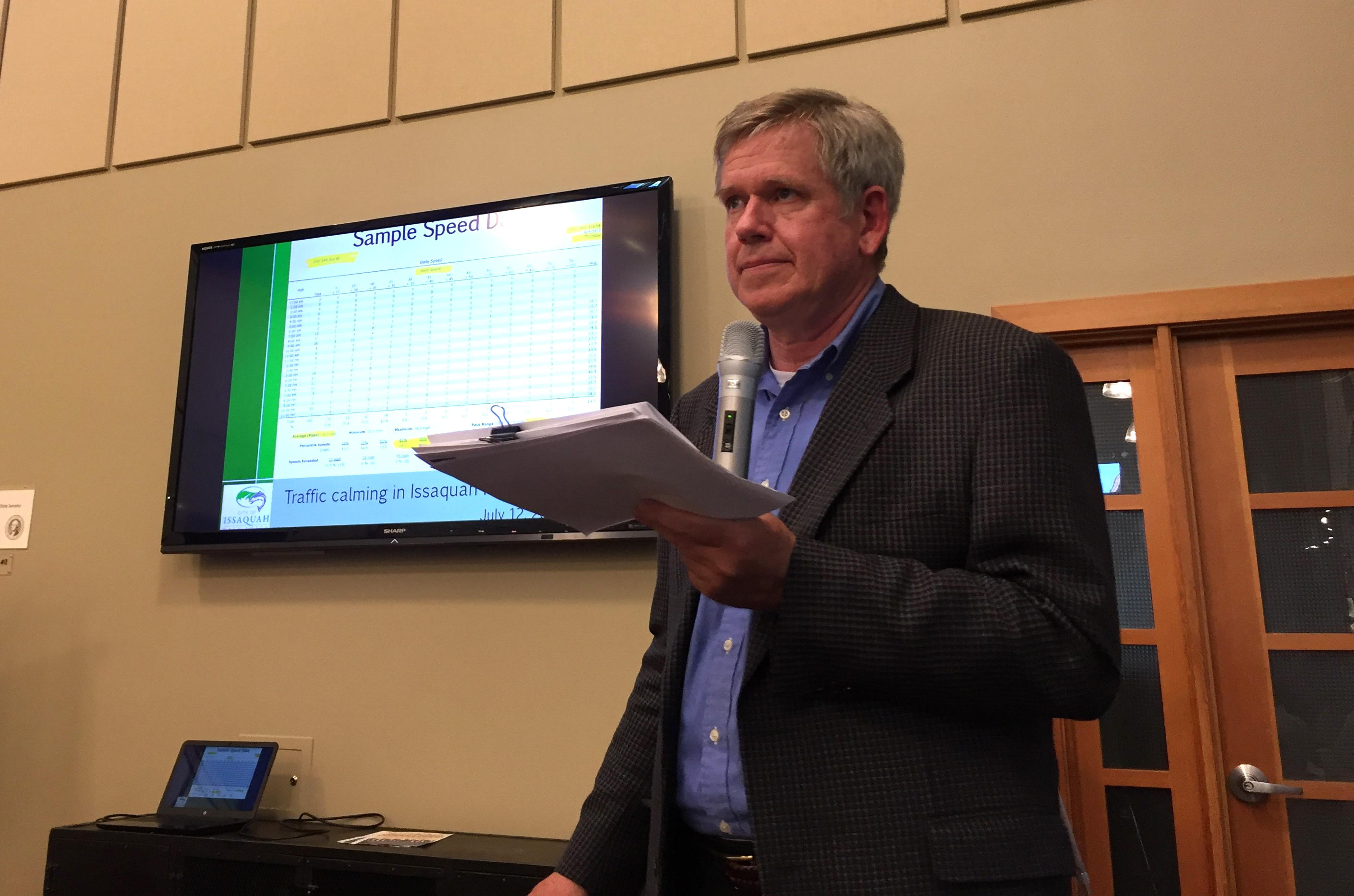 Kurk Seeman, City of Issaquah Transportation Manager, listened intently to questions about data collected on driver speeds.