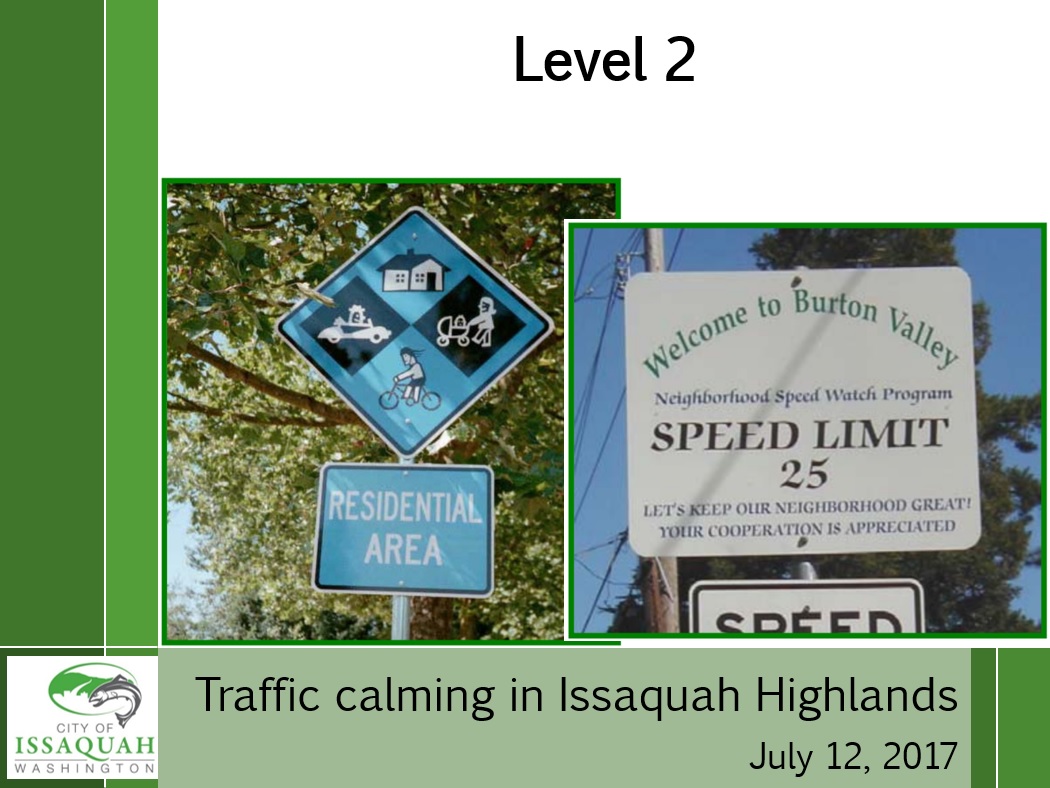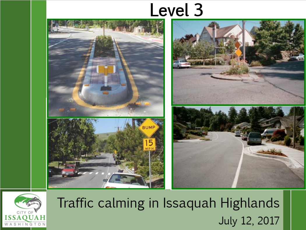 This meeting was called by the City of Issaquah to talk about “traffic calming” in Issaquah Highlands. They had collected data in June 2017 on driver behavior on 24th and 25th Avenues NE, south of Park Drive. Even though most drivers go the speed limit or less, at times the data showed many cars speeding, some over 70 mph. The City wished to share this data and discuss with the community ideas about how to slow drivers down on our neighborhood streets.