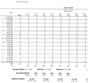 This meeting was called by the City of Issaquah to talk about “traffic calming” in Issaquah Highlands. They had collected data in June 2017 on driver behavior on 24th and 25th Avenues NE, south of Park Drive. Even though most drivers go the speed limit or less, at times the data showed many cars speeding, some over 70 mph. The City wished to share this data and discuss with the community ideas about how to slow drivers down on our neighborhood streets.